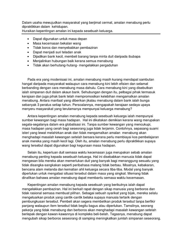 Contoh Karangan Bahasa Malaysia Amalan menabung perlu dipraktikkan dalam kehidupan untuk mewujudkan masyarakat yang berjimat cermat. Karangan Faedah Menabung Menabung bermaksud menyimpan sebahagian wang untuk masa hadapan. Faedah Menabung SPM Berikut adalah contoh karangan faedah menabung.